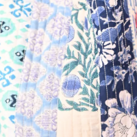 Woman wearing a blue floral dress indoors
